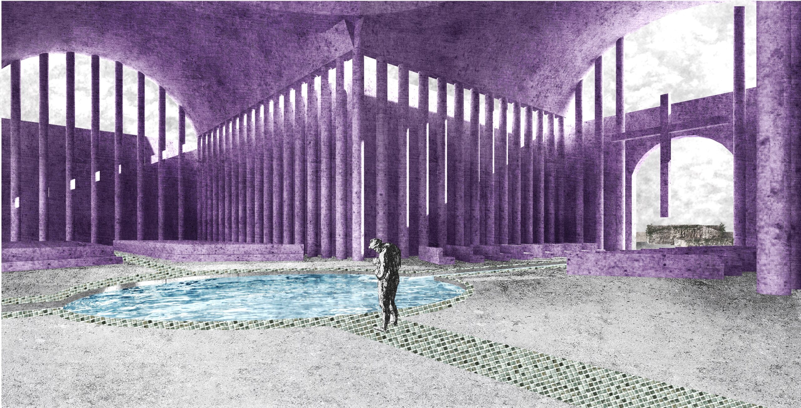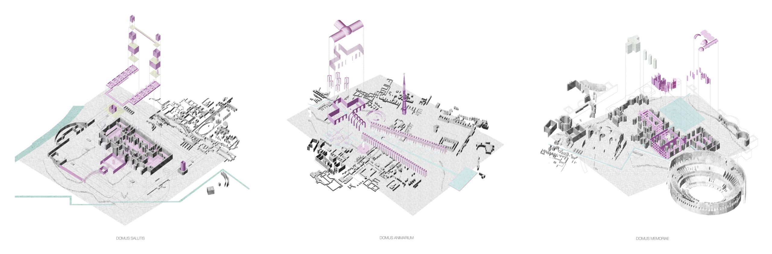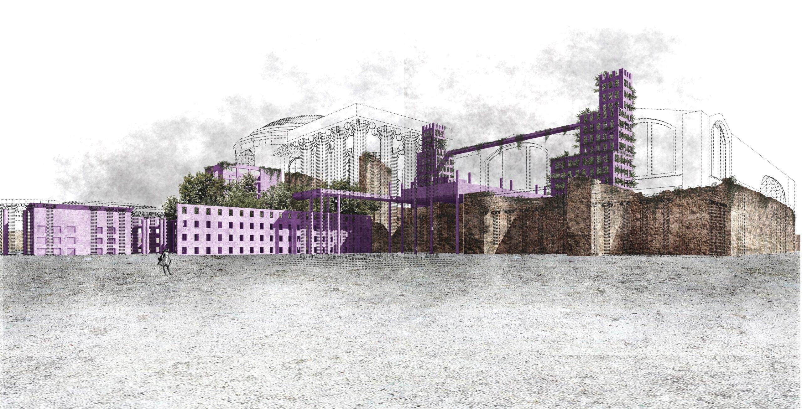 This building houses the function of health. The proposal is located in the Caracalla baths, the second biggest baths of Ancient Rome. The proposal provides the visitor with a contrast: the projected new structure is representative of our contemporary approach to institutionalised healthcare whilst the baths represent the ancient approach to health and well-being. By being projected on top of the bath’s ruins, the new structure puts the two approaches in tension.