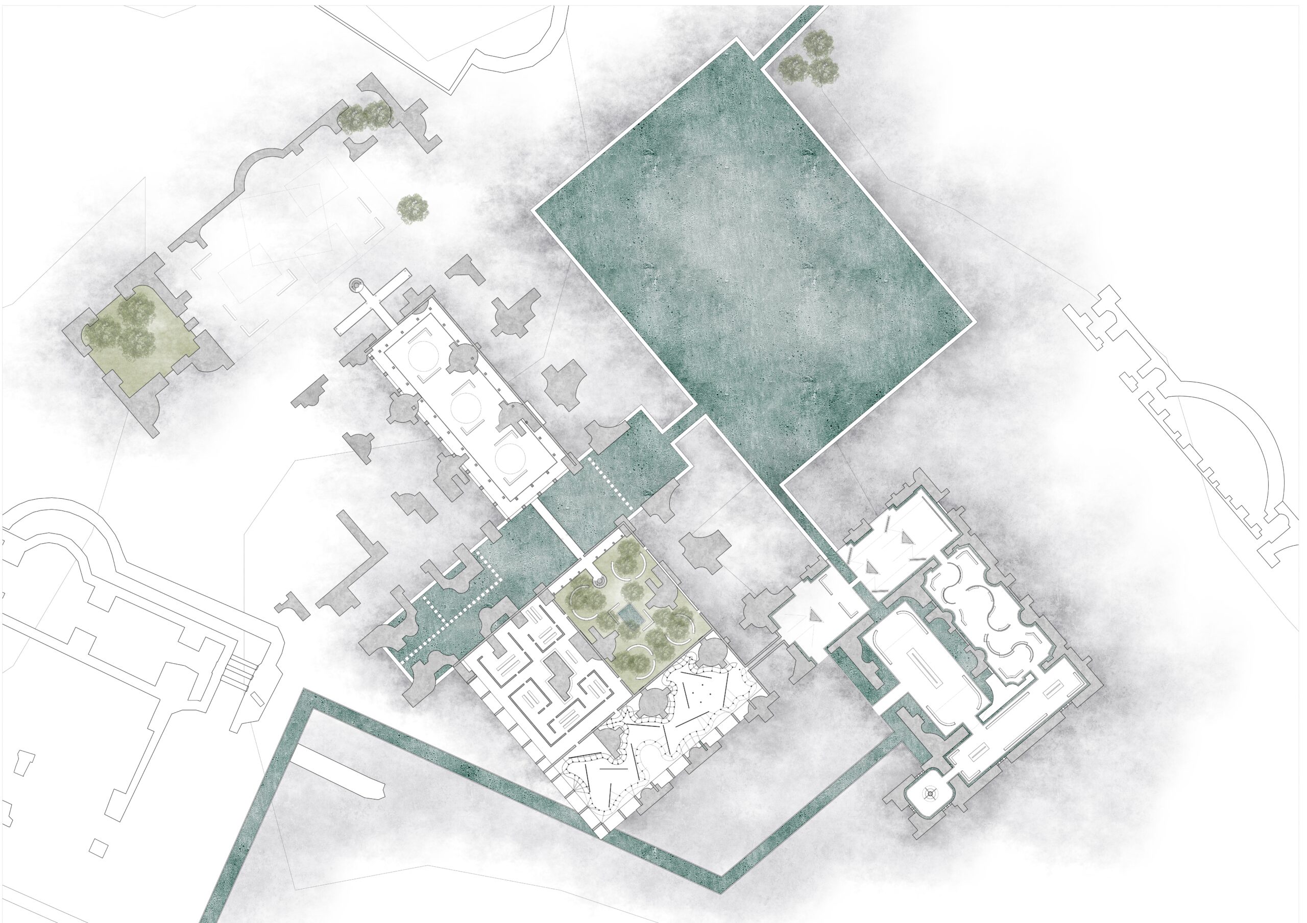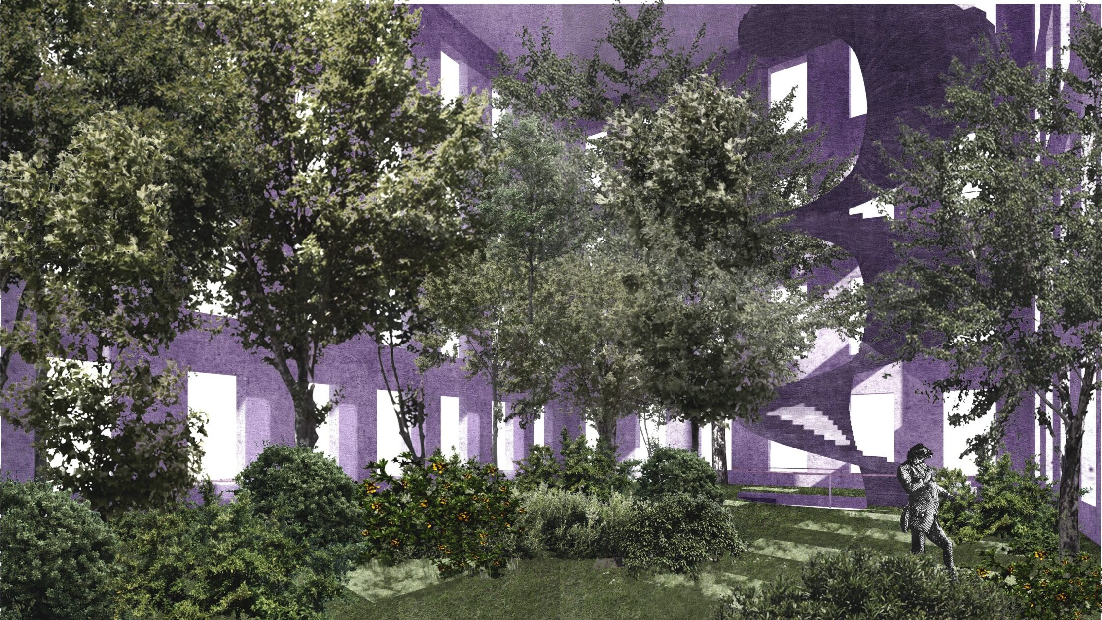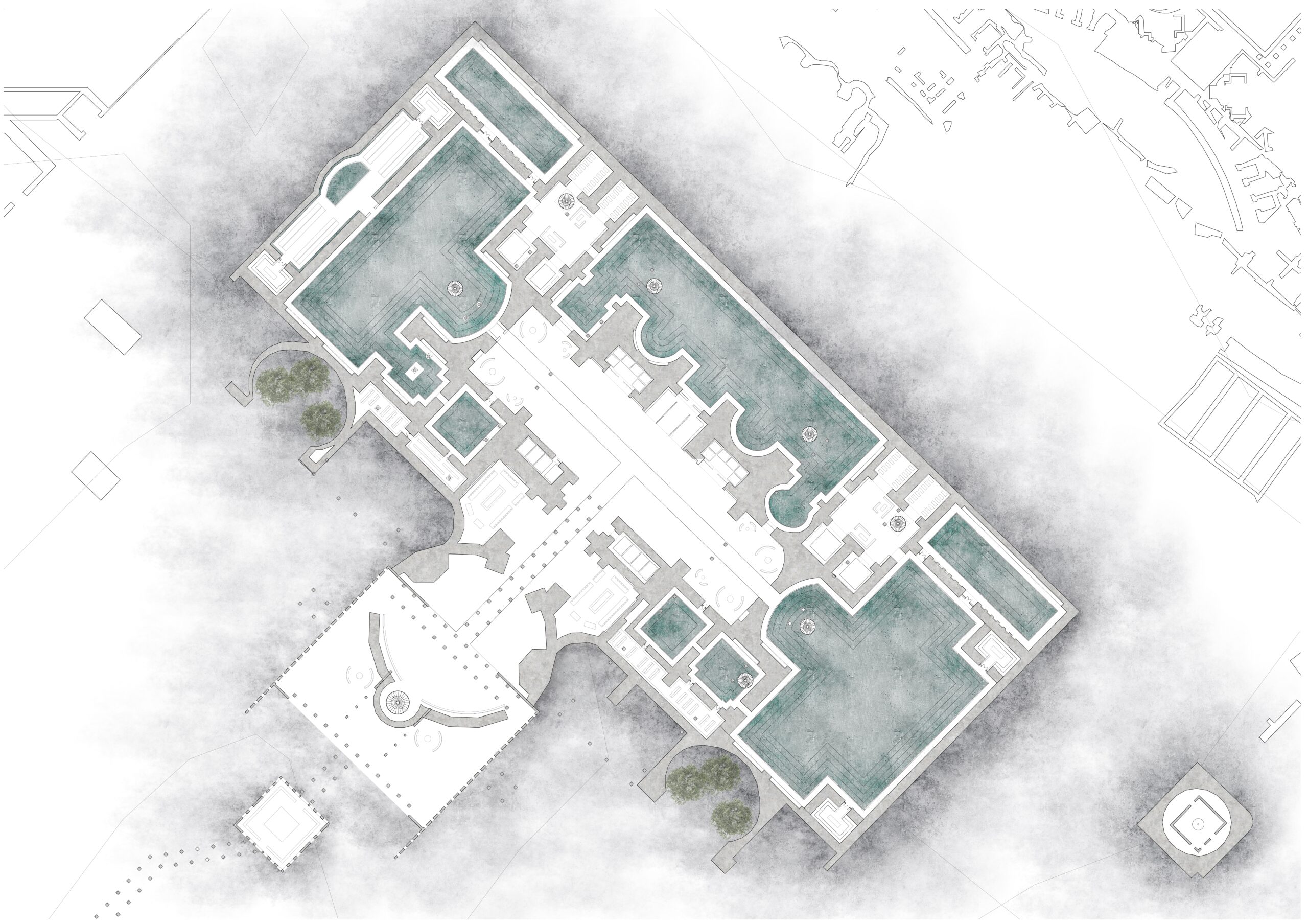 This building houses the function of health. The proposal is located in the Caracalla baths, the second biggest baths of Ancient Rome. The proposal provides the visitor with a contrast: the projected new structure is representative of our contemporary approach to institutionalised healthcare whilst the baths represent the ancient approach to health and well-being. By being projected on top of the bath’s ruins, the new structure puts the two approaches in tension.