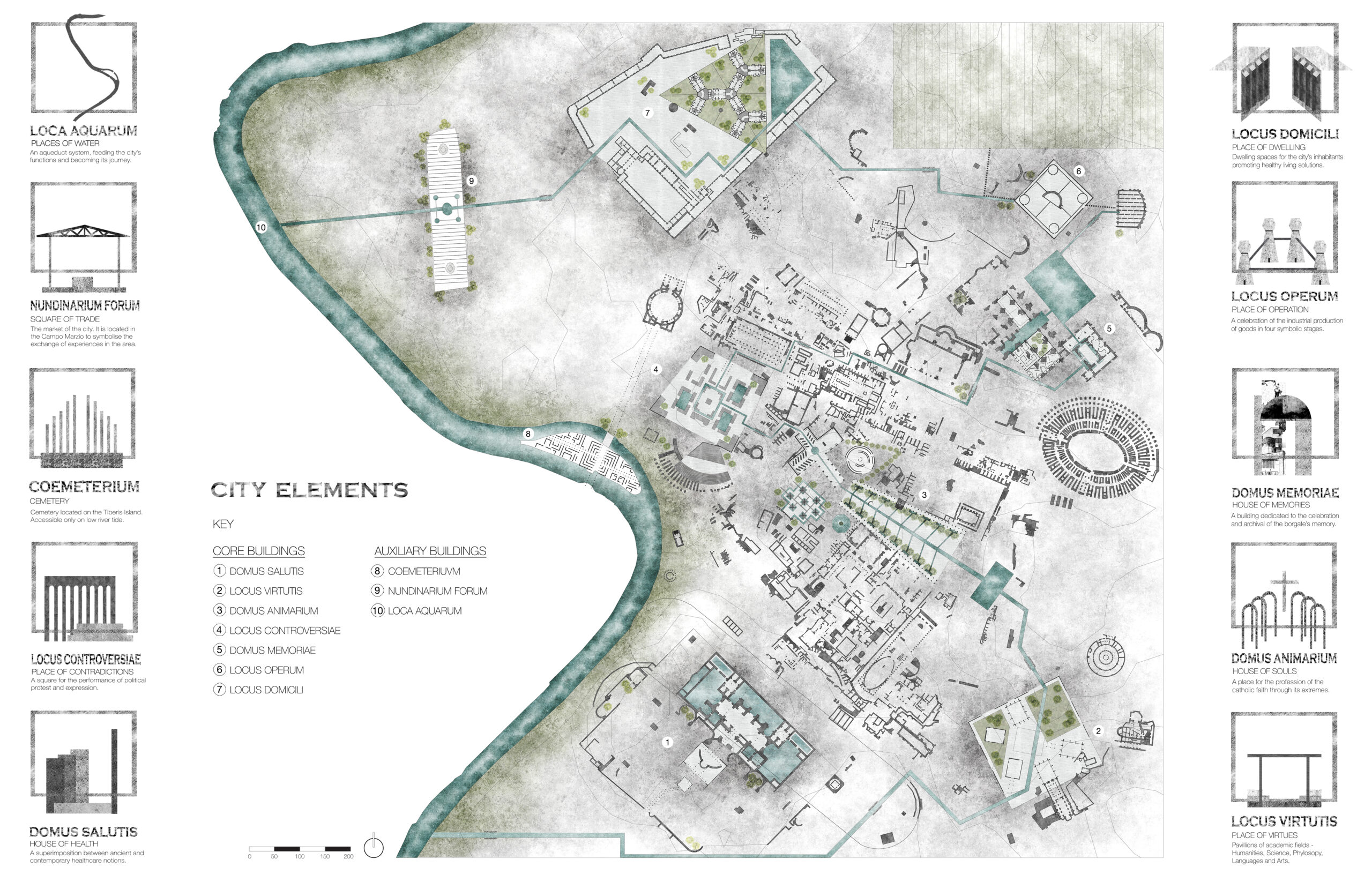 The project features a city masterplan that includes seven core functions and two auxiliary functions, accompanied by water infrastructure for the Tiber River. Of these, three core buildings have been developed in detail. The city axonometric illustrates the breakdown of the superimposition of these structures onto the landscape and ancient ruins, highlighting each core building and their conceptual construction process.