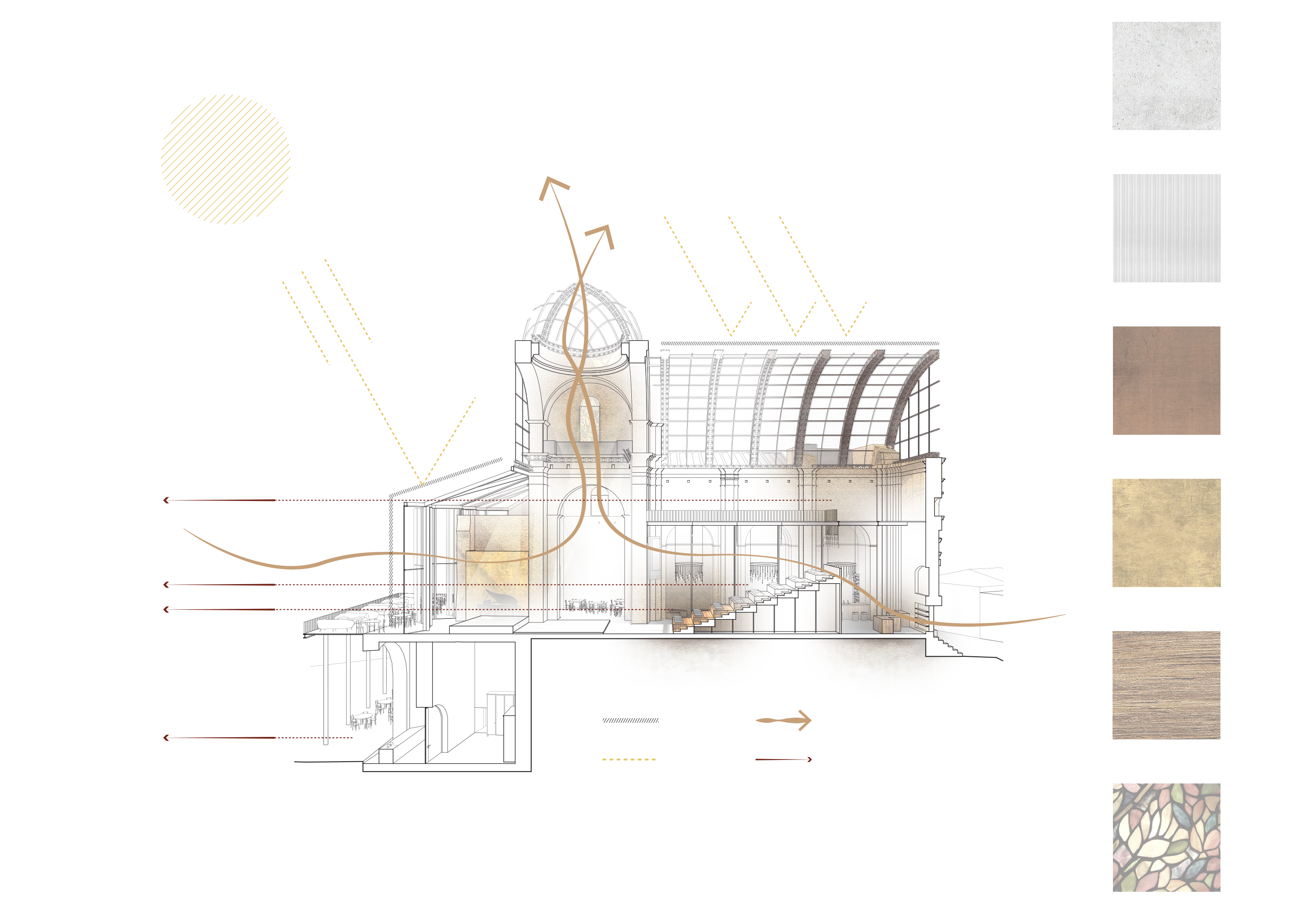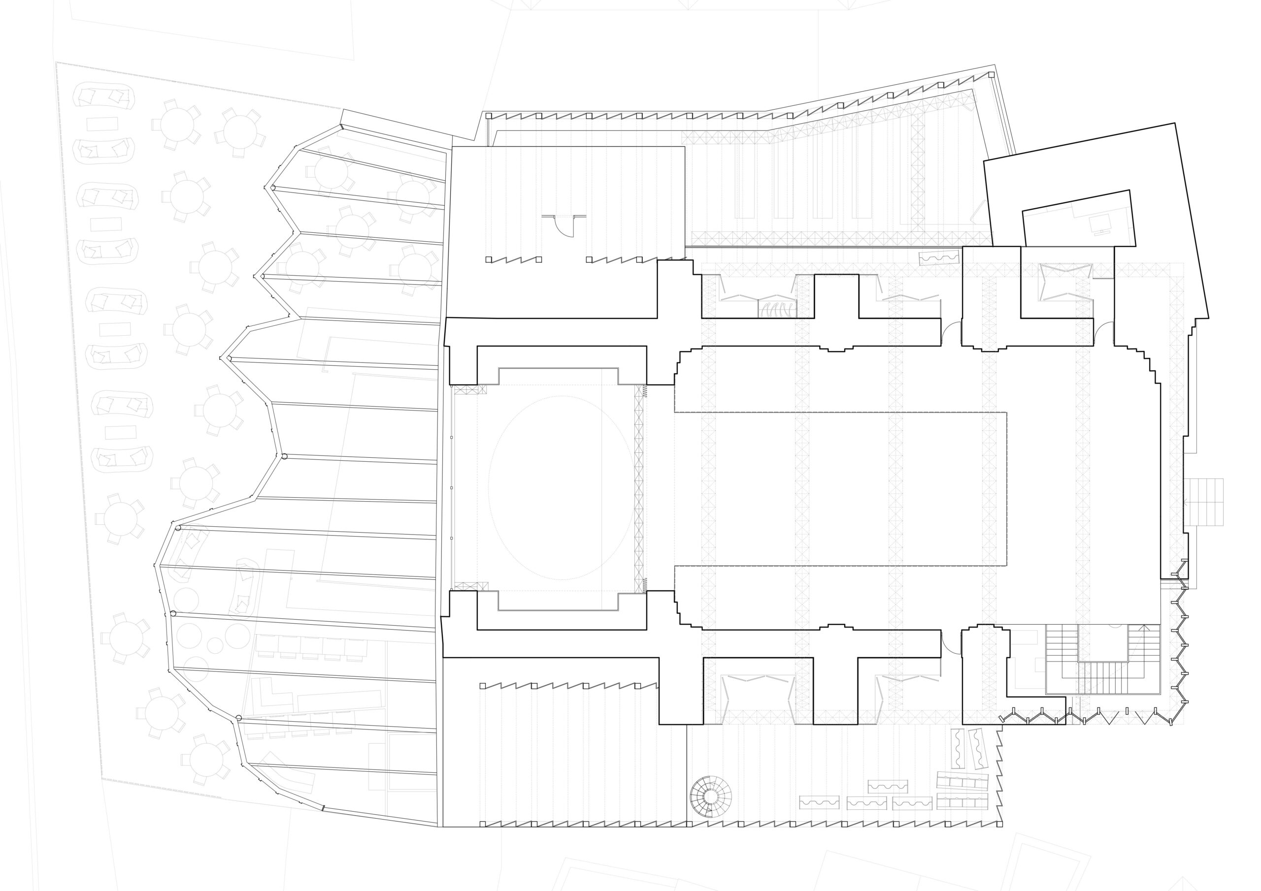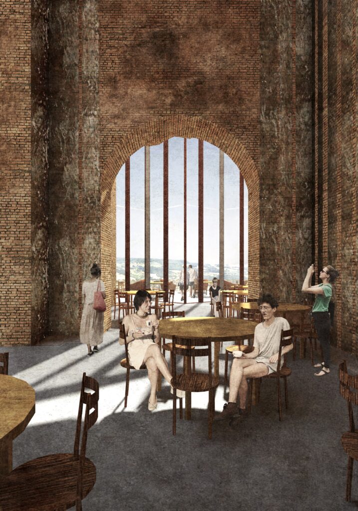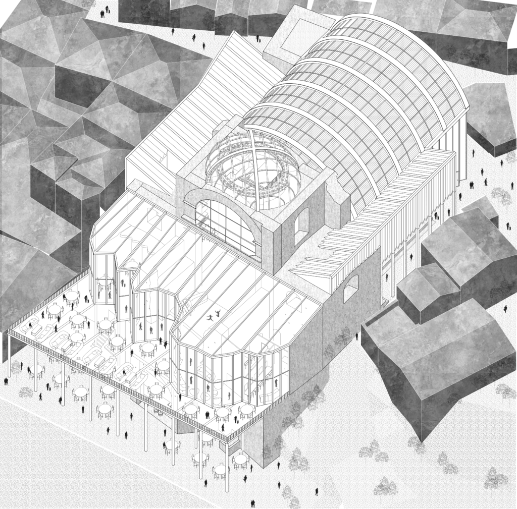 The proposal features a sealed indoor space accessible all year round, roofed with lightweight structures echoing the archetypal church – a translucent barrel vault roof and a transparent cupola. Visitors are welcomed via the eastern facade’s gap, now filled with a zigzagged, sliding curtain wall that mimics fragmentation and simultaneously serves as a service door for large-sized equipment. The church’s nave accommodates the audience of the main, staggered stage overlooking the valley. A retractable system allows the seating to be removed to serve a variety of concert atmospheres. The audience can also enjoy performances from amezzanine floor that exposes the church and the view from higher grounds.