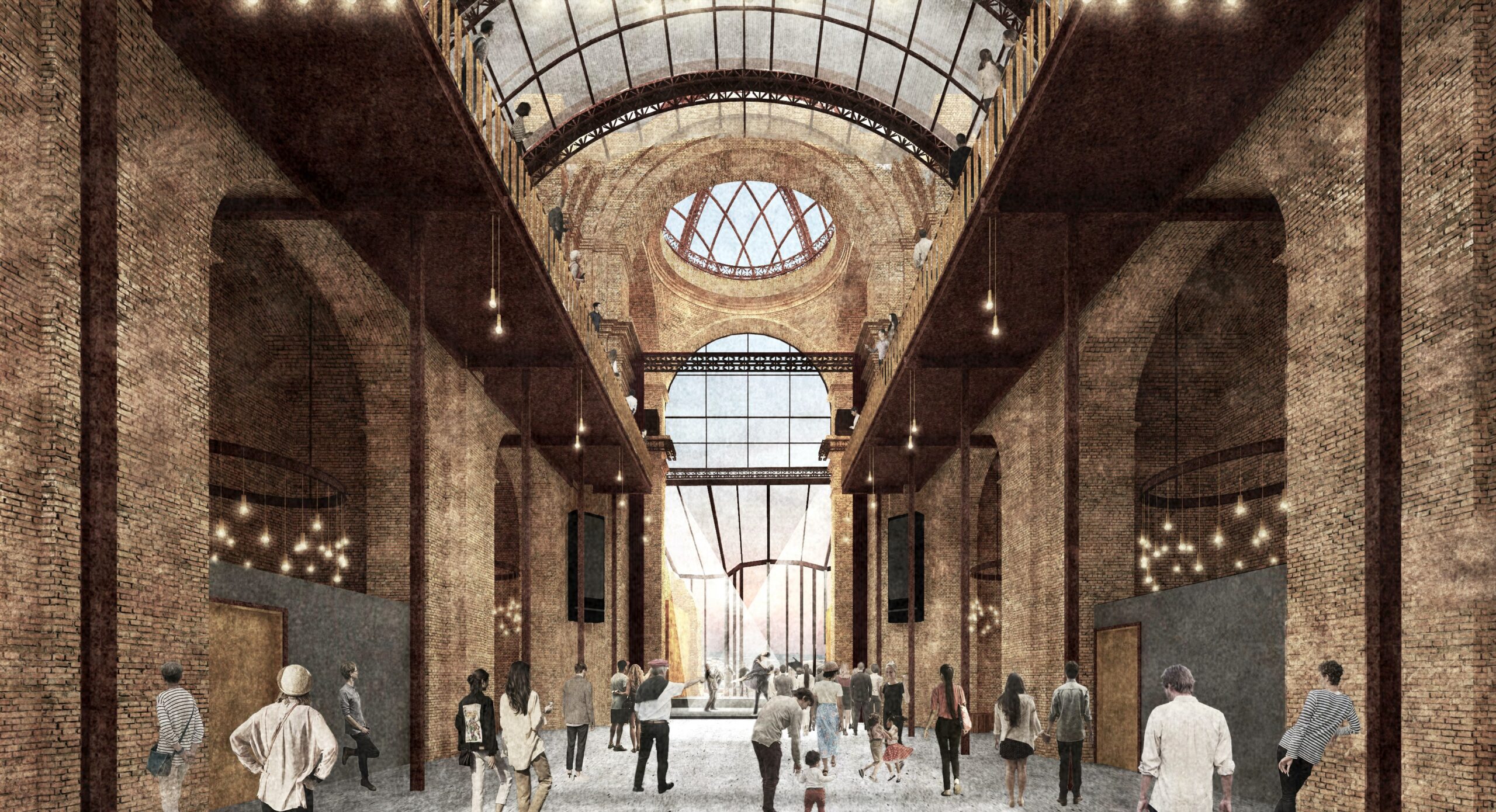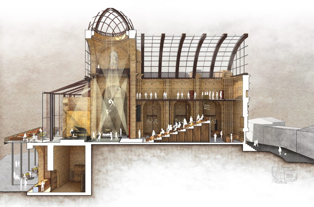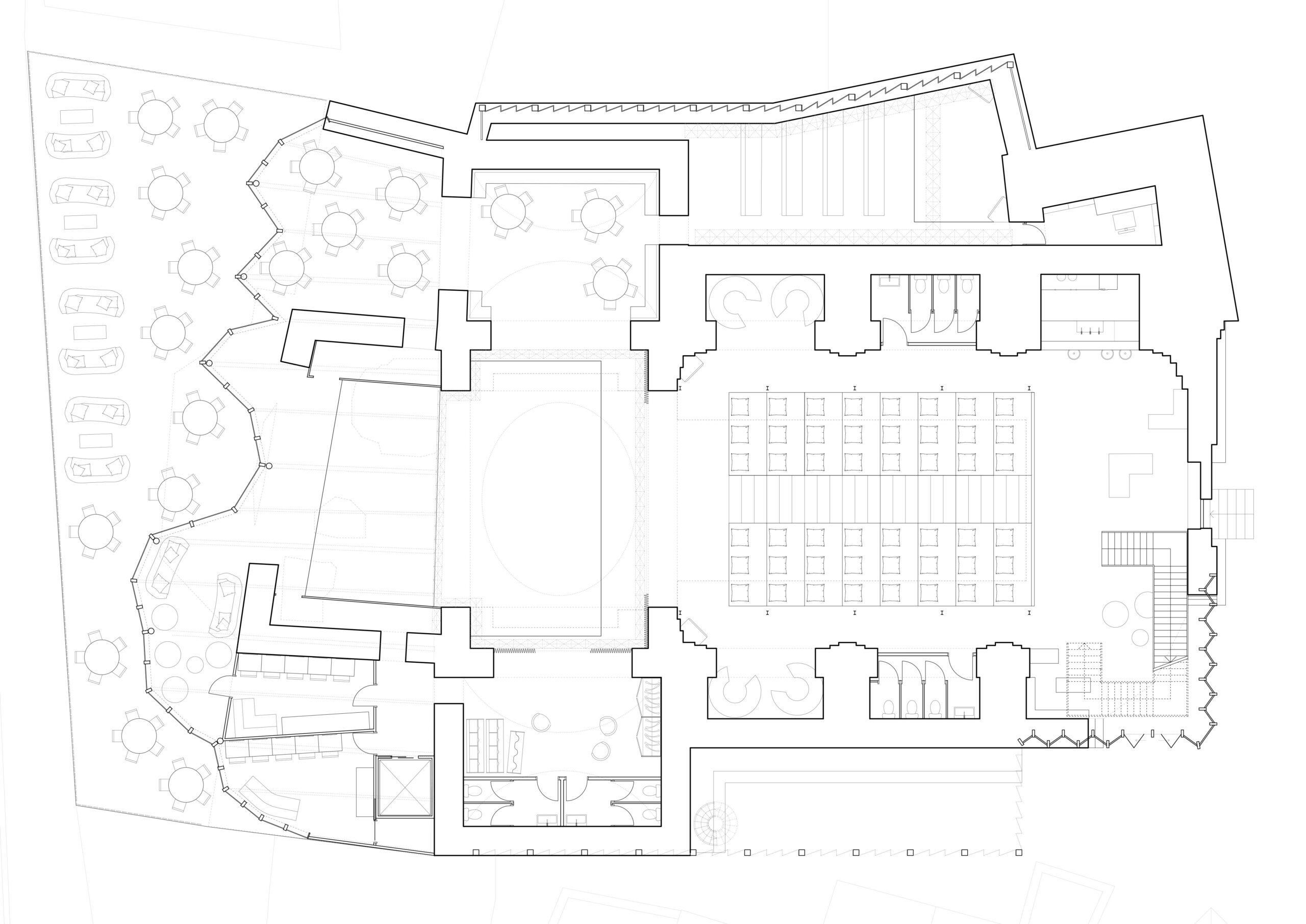 The proposal features a sealed indoor space accessible all year round, roofed with lightweight structures echoing the archetypal church – a translucent barrel vault roof and a transparent cupola. Visitors are welcomed via the eastern facade’s gap, now filled with a zigzagged, sliding curtain wall that mimics fragmentation and simultaneously serves as a service door for large-sized equipment. The church’s nave accommodates the audience of the main, staggered stage overlooking the valley. A retractable system allows the seating to be removed to serve a variety of concert atmospheres. The audience can also enjoy performances from amezzanine floor that exposes the church and the view from higher grounds.