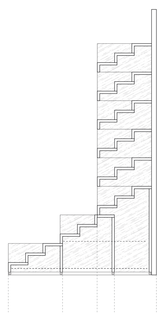 The seating is designed to retract vertically and is serviced with wheels to ensure it can be removed when needed. The sliding curtain wall by the building’s entrance is designed to accommodate the removal of the seating arrangement.