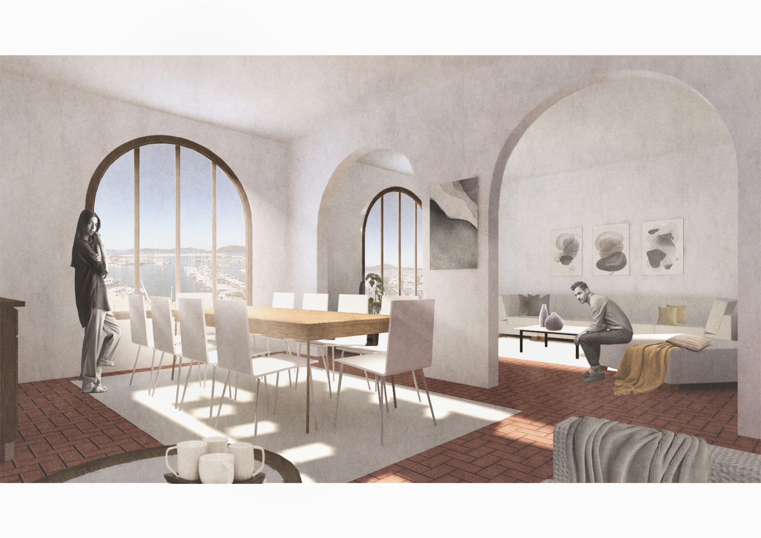 The interior design focused on creating a harmonious blend of modern comfort and historical charm. Each room was carefully planned to maximise space and functionality, while maintaining the flat’s unique character. Custom-designed furniture was crafted to complement the flat’s aesthetic, using durable materials that withstand the harsh coastal environment. Thoughtful details, such as built-in storage solutions and bespoke lighting fixtures, were incorporated to enhance the living experience and ensure long-term usability.